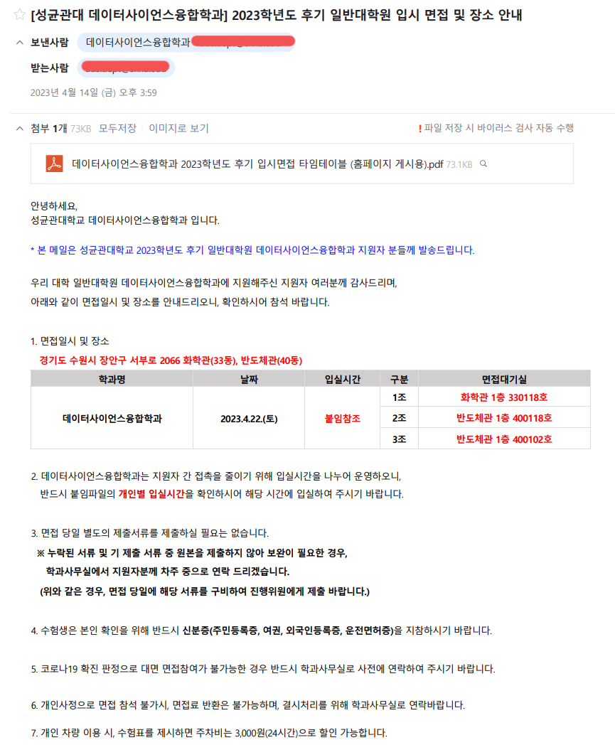 성균관대학교 데이터사이언스융합학과(이하 데사융) 는 일반대학원으로 분류되어서 다른 일반적으로 학부졸업 후 진학하는 대학원과 동시에 모집한다. 그러다보니 직장인이 지원할 수 있는 다른 데이터사이언스/빅데이터 (특수)대학원 중 전형일정이 가장 빨랐다. 결과적으로 이 학교 최종결과가 가장 발표됐고, 전형이 늦은 서강대, 한양대의 원서제출 비용을 절약할 수 있었다.