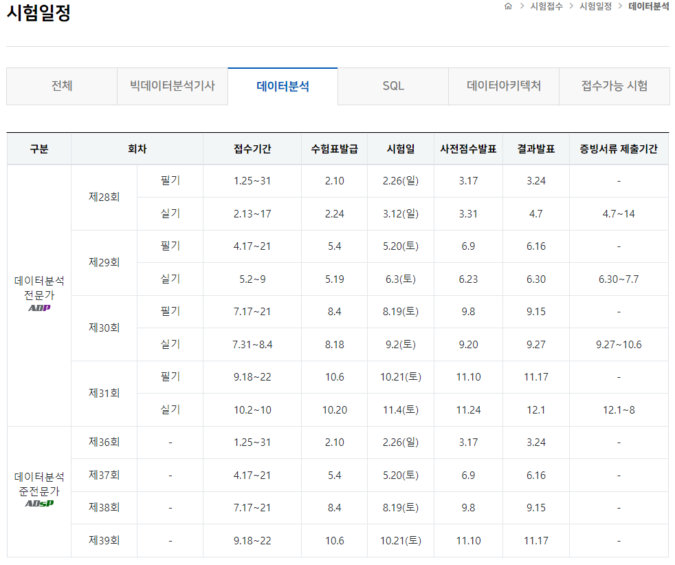 데이터자격검정 홈페이지 (https://www.dataq.or.kr/www/main.do) 시험접수 - 시험일정 에서 빅데이터분석기사/데이터분석(ADsP/ADP), SQLP/SQLD, 데이터아키텍쳐(DAP/DAsP) 모두 접수할 수 있다.
