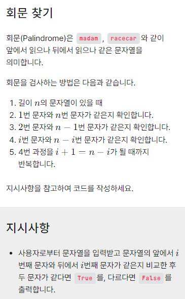 - 문자열/리스트의 index는 0부터 시작되므로 word[i] ==word[n-i-1]