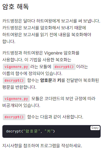 decrypt() 함수는 암호문과 키를 전달받아 복호화된 평문을 반환합니다. vingenere.py 모듈은 코더랜드의 보안 규정에 따라 비공개되어 있습니다. 지시사항을 참조하여 프로그램을 작성하세요.